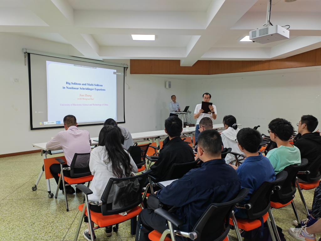 513日下午,“动力系统前沿进展学术会议暨培训班”邀请电子科技大学张健教授开展了题为《Big Solitons and Muti-Solitons in Nonlinear Schrodinger Equations》的学术讲座。张健教授首先引入和求解两个相关的约束变分问题,建立了双幂非线性薛定谔方程从给定质量到孤子频率的一一对应关系。然后给出了归一化基态的唯一性,证明了大孤子的轨道稳定性依赖于频率。此外,利用稳定的大孤子构造了不同速度的多孤立子解。