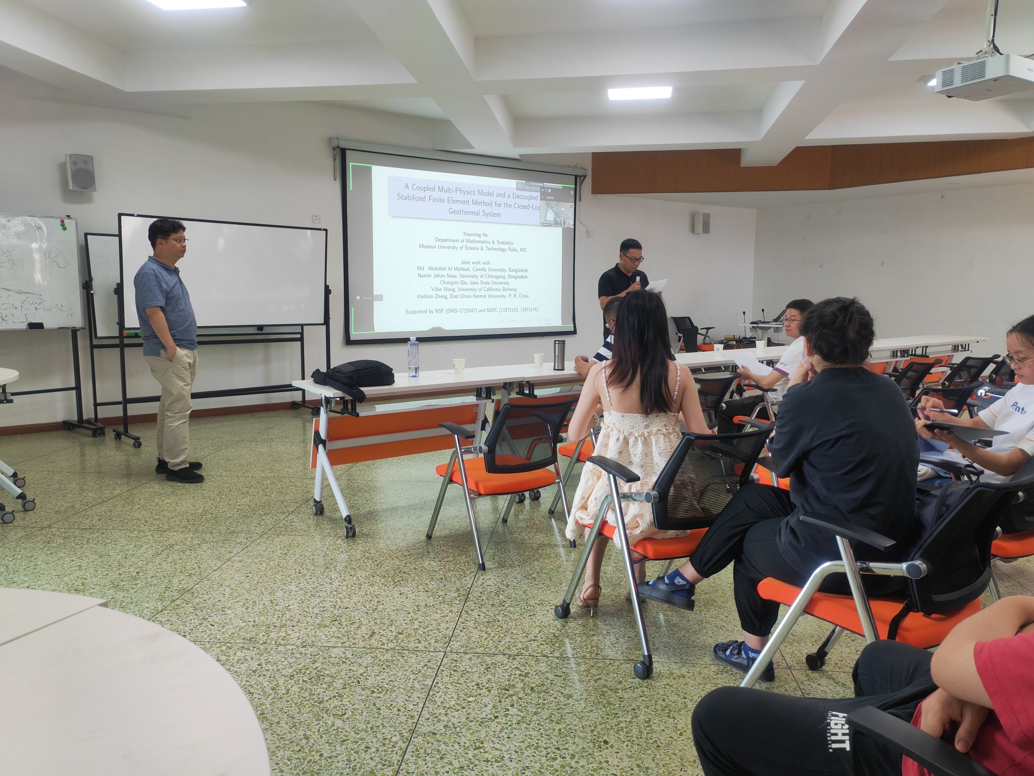 何晓明授报告题目是A coupled multi-physics model and a decoupled stabilizedfinite element method for closed-loop geothermal system. 主要讨论了利用地热能在封闭环境下的水热系统的多物理耦合模型和解耦稳定有限元方法。会议上针对实际物理问题,何晓明教授使用Boussinesq方程、修正的Darcy方程等进行建模,用有限元方法解方程,做离散,做成矩阵格式,再通过解耦、显式处理、迭代计算、条件加稳定子,先做稳定分析再做收敛分析,最后使用算例验证,验证收敛等方法证明结果的正确性。何晓明教授的学术报告深入浅出,简明扼要,生动形象,深受老师和学生欢迎。