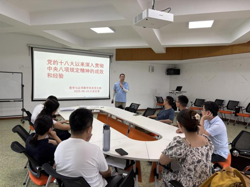数学与应用数学系党支部6月10日在信息楼6楼大会议室召开支部大会,围绕深入贯彻中央八项规定精神学习教育,支部书记廖开方强调,制定实施中央八项规定是我们党在新时代的徙木立信之举,全体党员同志要清醒认识违规吃喝问题的政治危害,要不断增强严格落实中央八项规定精神的政治自觉、思想自觉、行动自觉。会上,廖开方带领全体党员加强学习了党的六项纪律,包括政治纪律、组织纪律、廉洁纪律、群众纪律、工作纪律、生活纪律。6月12日支部开展深入贯彻中央八项规定精神学习教育警示教育专题学习,廖开方结合相关警示教育案例,包括违规吃喝、违规收送礼品礼金、借调研和培训等名义公款旅游等问题开展警示学习教育。会议还传达学习习近平总书记在贵州、云南、河南等地考察时的重要讲话精神。7月4日,学院院长周钰谦以《深入贯彻中央八项规定精神学习教育》为题,为数学与应用数学系党支部开展专题党课,周钰谦深入浅出解读中央八项规定及其实施细则,结合自身学习与工作实践,阐述厉行勤俭节约、反对奢侈浪费和奢靡之风、廉洁从政、工作作风务实的精神实质,并通过案例剖析,教育党员知敬畏、存戒惧、守底线。