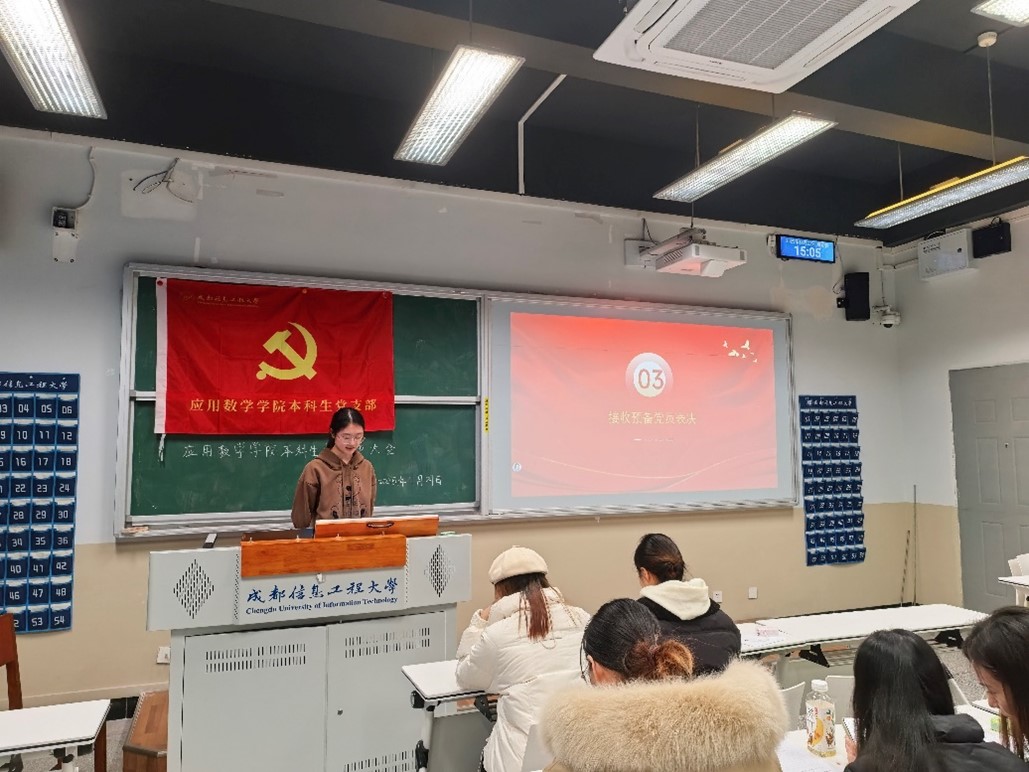 会议第三项,发展对象向党组织汇报对党的认识、入党动机、个人经历以及在校表现等,随后入党介绍人向大会介绍其主要政思想、学习、工作生活等情况。大会认为,彭瑾、韦佳佳、陈颖、袁欣、王佳翔、何琪、唐艺同志基本符合党员条件,经与会正式党员投票表决,同意将该7名同志吸收为预备党员。