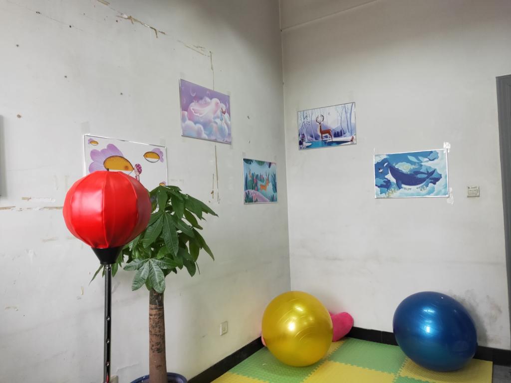 工作室室内设有宣泄区和谈话区。宣泄区内提供有沙袋、情绪宣泄棒、瑜伽球等器材,为前来咨询的同学提供情绪宣泄的途径。此外,谈话区内舒适的沙发、温馨的挂画、以及生机盎然的绿植都能使到访同学身心放松,增加心理咨询的效果。