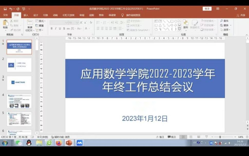 最后,学院院长周钰谦对进行了总结,他肯定了这一年来学院教师的辛苦付出。面对新冠疫情和教学安排的不断变化,学院教师积极应对,教学任务顺利完成;面对重重困难,全院上下一心成功完成科研、人才引进、创收等任务;同时学院今年取得了省级教学成果二等奖在内的诸多标志性成果。他代表学院,向辛勤耕耘、默默奉献在教学、科研、管理等岗位上的全院教职工致以了最诚挚节日问候,也希望大家在未来的教学科研工作中能百尺竿头更进一步。
