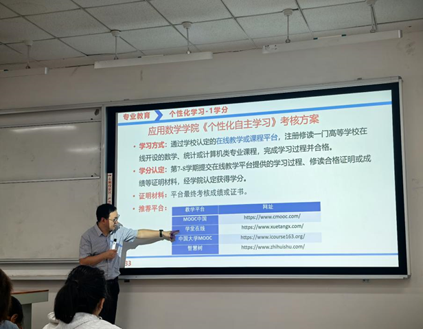 胡院长以“探索数学奥秘,珍惜大学时光,开启专业征程,开拓卓越境界”为主题,从博彩公司推荐概况 、专业定位、培养方案、发展建议等多个维度系统解读,为新生介绍考研、就业、科研多发展方向,为新生带来一场兼具深度与温度的专业启蒙。