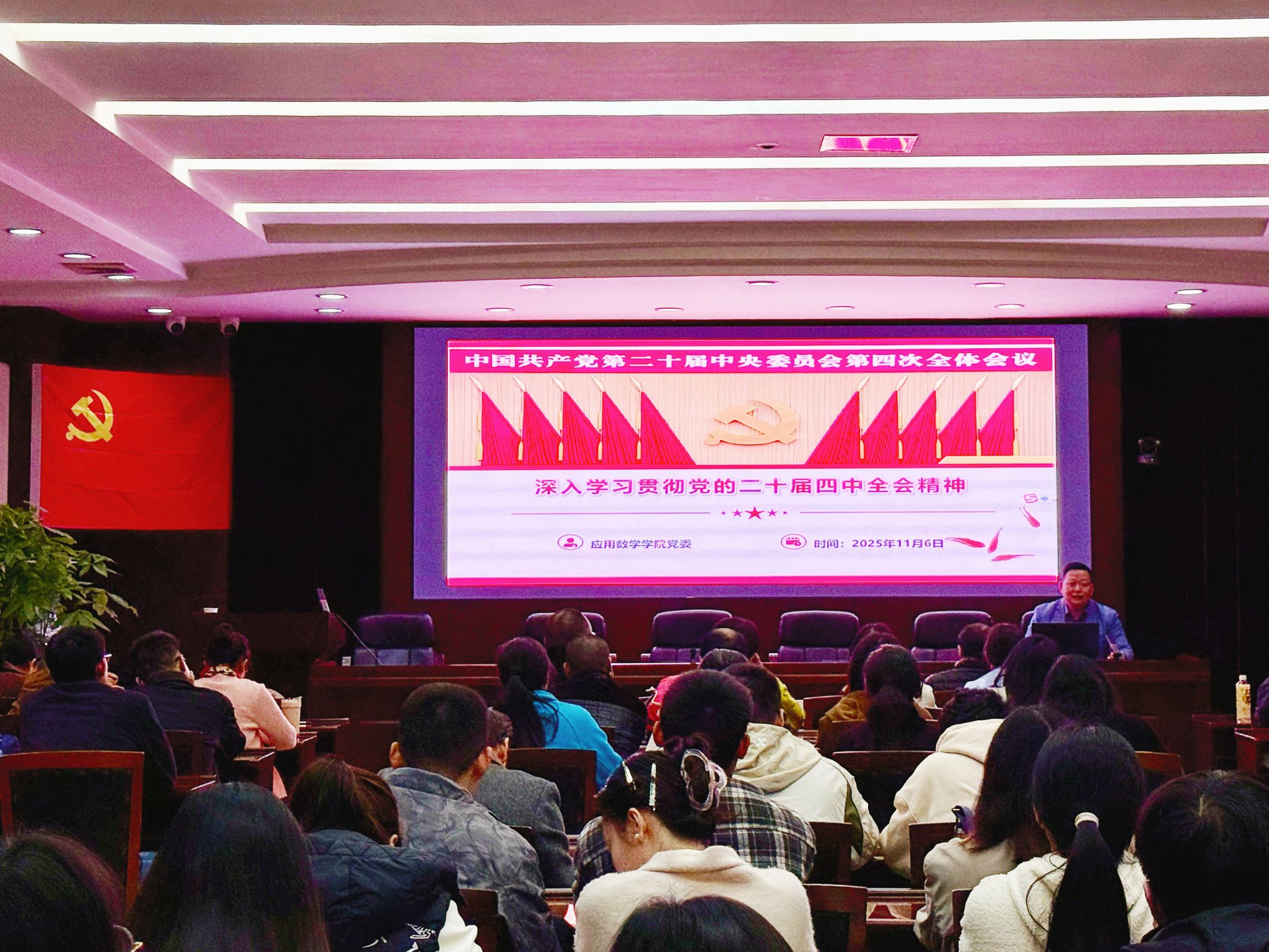在计票期间,林细俤领学了《中国共产党第二十届中央委员会第四次全体会议公报》核心要义、习近平总书记的重要讲话以及全会通过的《中共中央关于制定国民经济和社会发展第十五个五年规划的建议》。他重点围绕党的二十届四中全会内涵、“十五五”规划重要性、“十四五”成就、党的二十届四中全会擘画的未来蓝图及贯彻落实党的二十届四中全会精神的实践路径展开解读。他指出,要将学习宣传贯彻党的二十届四中全会精神作为全院上下当前和今后一个时期的重大政治任务,各党支部、教研室要精心组织开展学习宣传工作,引导广大师生深刻领会全会精神,深学细悟、学以致用,自觉把思想和行动统一到党中央决策部署上来,为实现“十五五”良好开局打牢基础,推动学院各项工作高质量发展,为教育强国、科技强国建设贡献数学力量!