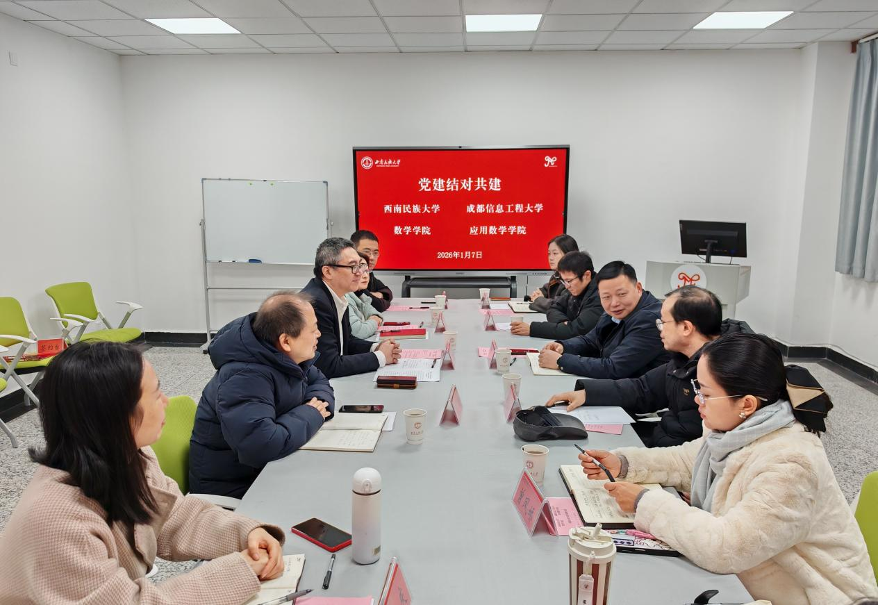 领导老师的到来表示热烈欢迎,并就西南民族大学数学学院基本情况特别是学院以党建引领学科发展、筑牢育人根基的实践探索进行了专题介绍,他提出,希望以此次党建共建为纽带,深化两院在教学资源共享、科研项目协同、人才联合培养等方面的合作,实现优势互补、协同发展;谭颖介绍了学科布局、师资队伍建设、科研等方面经验做法;李庆重点介绍了入选全国高校“双带头人”教师党支部书记“强国行”专项行动团队——数学与应用数学教工党支部的建设思路和具体措施;刘晓光介绍了学院双创和学科竞赛方面的经验和措施。