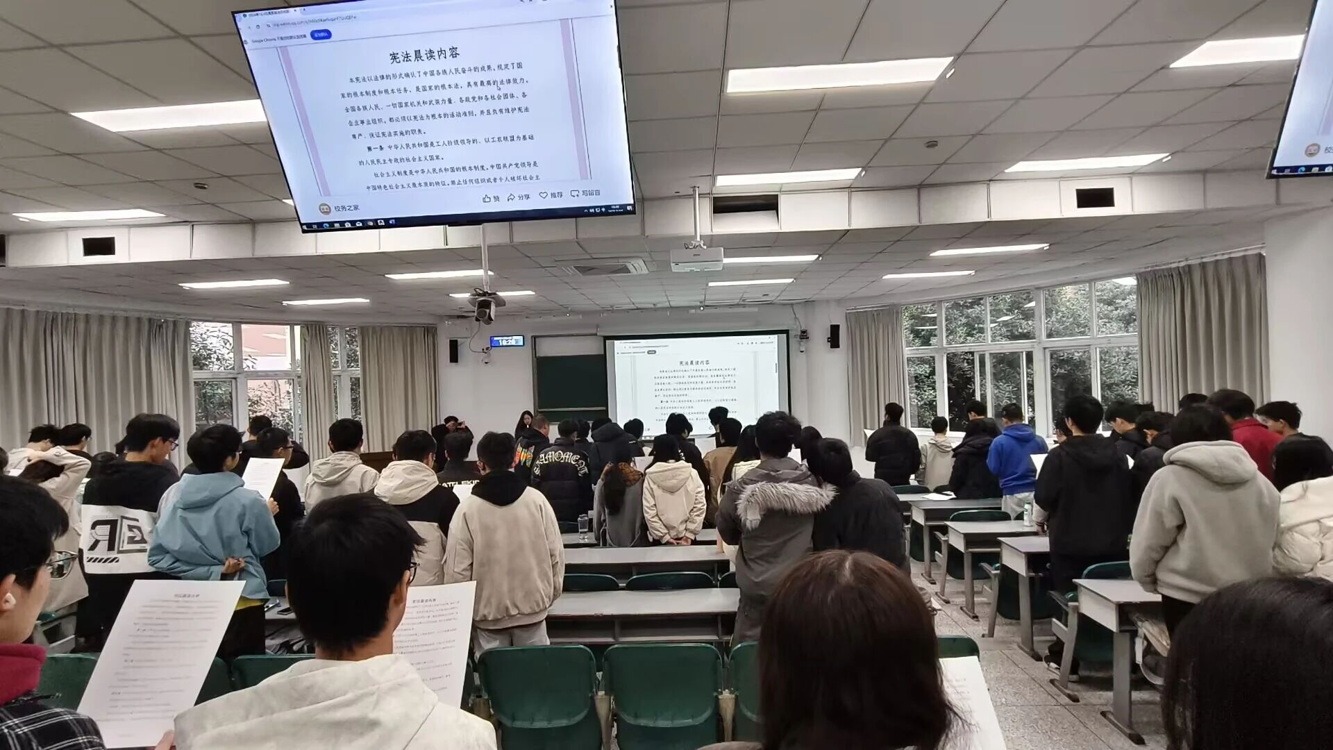 党委组织全体大一学生在4213教室开展“宪法晨读”活动。